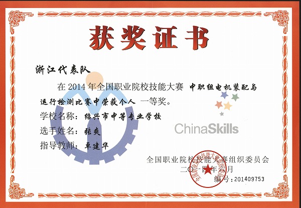 张爽同学荣获2014年全国职业院校技能大赛中职组电机装配与运行监测比赛项目一等奖