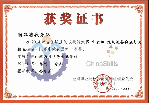 郑科、俞鑫同学荣获2014年全国职业院校技能大赛中职组建筑设备安装与调控(给排水)比赛项目一等奖