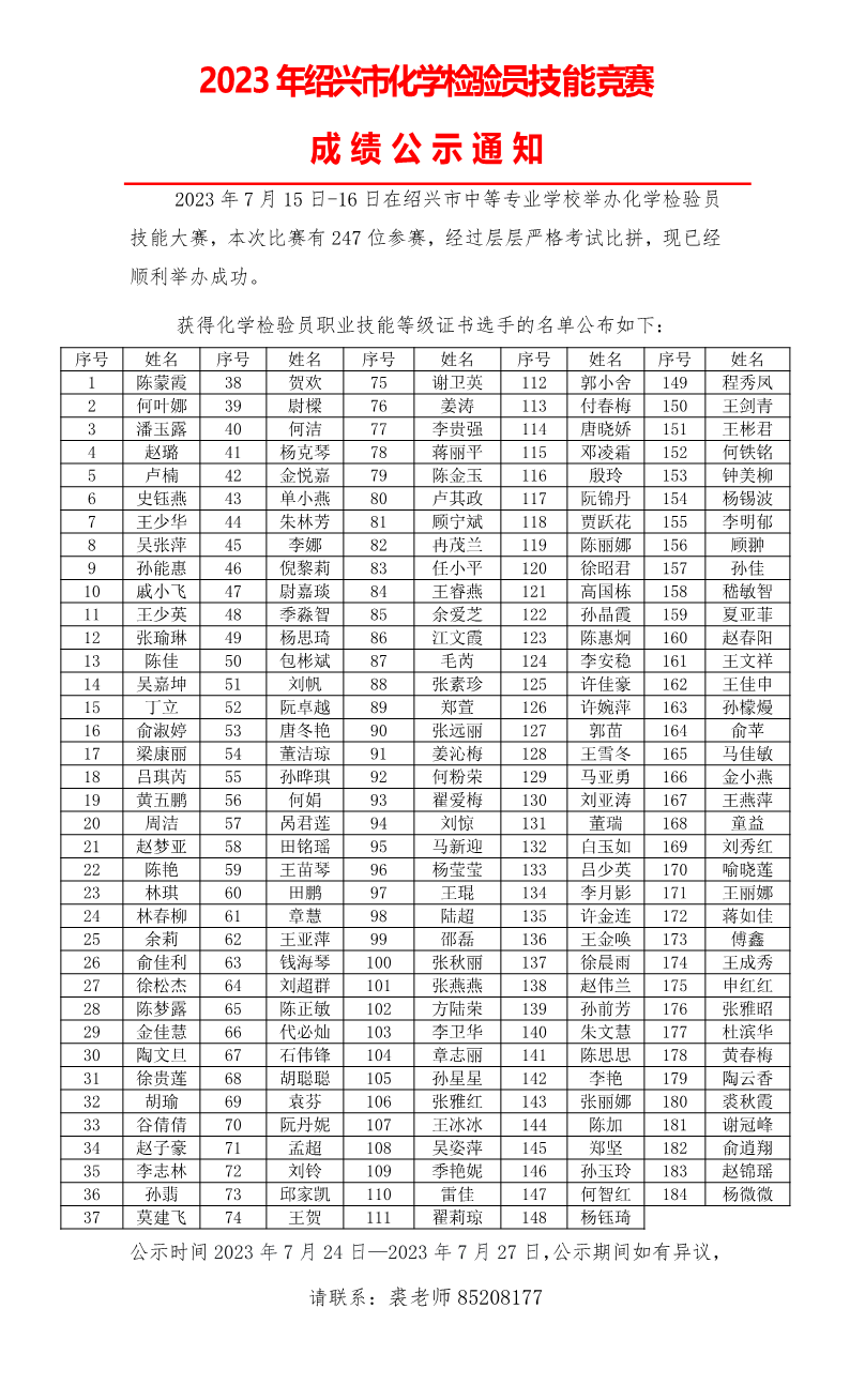 化学检验员合格人员公示