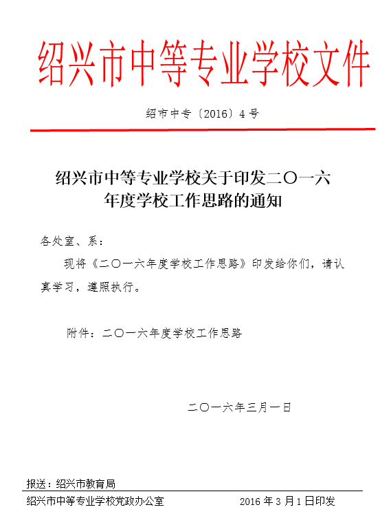 世界杯在线(中国)唯一官方网站关于印发二○一六 年度学校工作思路的通知 来源:校办公室 作者:sxzz 发布时间:2016-03-01 浏览次数: 次 【字体:小 大】 绍市中专〔2016〕4号-世界杯在线(中国)唯一官方网站2016年度工作思路.docx