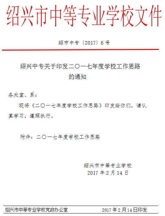 绍兴中专关于印发二○一七年度学校工作思路