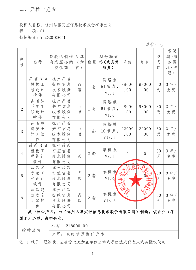| 1 | 218000元 | 杭州品茗安控信息技术股份有限公司 | 西斗门路3号天堂软件园B幢5楼C座 |