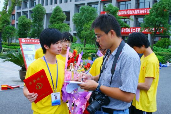 上午10点,在办公室的组织下,欢迎仪式正式拉开帷幕。建工、机电学区师生列队整齐,拭目以待,手持鲜花站在校门口迎接“功臣”凯旋。当参赛师生代表团身穿整齐的服装、在邵国成副校长的带领下气宇轩昂地走进校门时,迎接他们的是一片热烈的掌声和一束束美丽的鲜花。绍兴中专党委书记王成相、副校长王慧莉上前与归来的“英雄”们亲切握手,表示祝贺和欢迎。随后,获奖代表师生接受了绍兴晚报和电视台记者的采访。最后,参赛师生一起合影留念,把欢迎仪式推向了高潮。