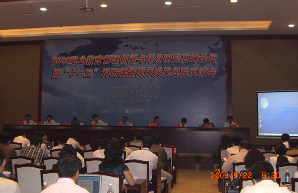 2009职业教育管理创新与评价研究高峰论坛于 5月 23日 至25日在绍兴举行,国家教育部、中央教科所的领导和来自全国各地的120多名职教专家齐集一堂,研讨职业教育教学改革大计。在开幕式上,作为本次论坛的承办单位,绍兴中专娄华水校长做了精彩发言,介绍了学校全人教育理念,汇报了模块化教学改革的成果。