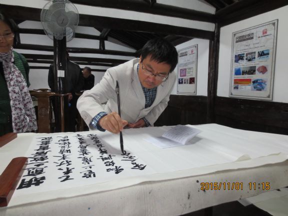 说起上虞丰惠镇,“英台故里”可谓家喻户晓,“上虞县、祝家庄玉水河边,有一个祝英台才貌双全……”越剧《梁祝》从嵊州唱到上海,再从上海唱到日内瓦,于是我们慕名再次来到丰惠古镇。而这次考察采风的重要目的地是名贤胡愈之故居,此地为上虞区闻名遐迩的“爱国主义教育实践基地”,为增进友谊、传承胡老爱国主义精神,书画分会部分书画家云集一堂,于当日上午在故居“原胡老书房”进行现场书画笔会活动。怀揣着对丰惠镇古今名贤的敬仰之情, 2015年 11月 1日 ,市华夏书画学会书画分会、摄影分会部分成员在学会秘书长、市教育局钱伟平副局长的带领下赴丰惠古镇作为期一天的实地采风、考察,上虞区方静副区长、曲艺家 吴宝炎 先生、书画 家张关卣 先生、企业家 周金弟 先生等热情地接待了我们。我校盟员陈蔚南、 钱桂香 老师,及 杨赟 老师参加了本次活动,收益良多。