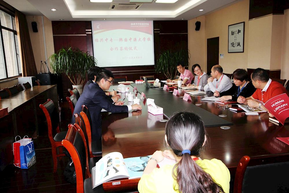 5月5日,韩国中源大学校对外协议处金处长、国际交流院院长全教授和朱博士一行三人来绍兴中专访问交流,商洽合作办学的相关事宜,并与学校签订了合作办学协议。绍兴中专校长邵国成、党委书记王慧莉、副校长於芳等学校领导会见了韩国客人,相关处室和系部负责人也参加了交流活动。