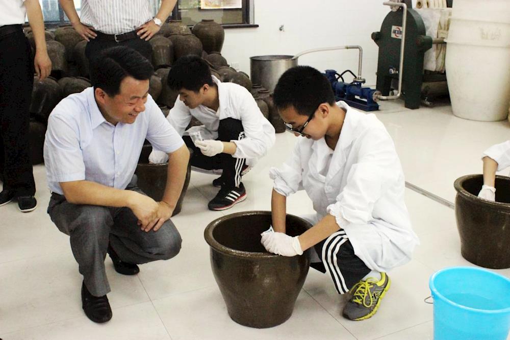 紧接着傅书记又参观了黄酒陈列馆、陶艺吧和黄酒DOS生产线等专业社团和实训基地。在黄酒陈列馆傅书记倾听了学校黄酒业人才孵化园的建设情况和绍兴黄酒的历史,品尝了同学们亲手酿造的黄酒,观看了同学们为酒坛彩绘雕花;在陶艺吧他对同学们亲手制作的陶艺作品赞赏有加;在黄酒DOS生产线他近距离了解了绍兴黄酒手工酿造和机械化生产的两种工艺流程。在手工酿造的现场,傅书记还详细询问了同学们技能学习情况。最后,他鼓励同学们要培养兴趣、苦练技能、积极进取、开拓创新、学好技能、服务社会,让自己的青春在时代进步中焕发出绚丽的光彩。