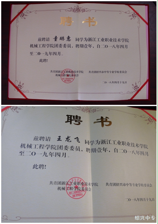 在启动仪式上,浙工院 机械工程学院团委向 我校王龙飞与童琳慧两位同学颁发团委委员聘书;我校团委向浙工院金佳铭 等 两位同学颁发聘书。